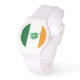 Green, orange and white tricolor of the Irish flag of Ireland with a clover in the middle.