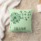 This fun pillow has a green dandelion on it with clover blowing in the wind, instead of parachute puffs. Below it says IRISH. Set against a pale green background. The reverse side of the pillow has the same pale green background and is then covered with a pattern of clover.