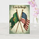 This design shows two crossed flags on shiny gold staffs, leaning toward each other like close friends sharing a quiet moment 💚. The left flag is a deep emerald green with a detailed gold emblem that resembles a Celtic harp, outlined in glowing gold lines. On the right, the American flag appears slightly aged, with softened red stripes and a muted blue canton dotted with pale stars, giving it a gentle, timeworn look. Their poles overlap neatly at the center, and the gold finials catch the light as if they’re being shown off for a special day ☘️. Above the flags, “Erin Go Bragh” sits centered near the top in a serif font, with gold lettering edged by a darker outline for contrast. Behind everything is a pale sage-green background with a lightly mottled texture, like brushed paper with a soft patina. The green banner curves outward on the left while the American flag drapes to the right, both with visible folds and shaded ripples along their edges.