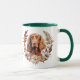 A pretty autumn wreath in tones of cinnamon brown, tan, and cream surround the watercolor image of a beautiful red Irish Setter dog. The image is printed twice on the mug, with your custom text between them.