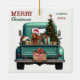 A teal blue retro pickup truck carries a decorated Holiday tree and gift packages on this cute ceramic Christmas ornament. Looking out from the tailgate is a beautiful Irish Setter dog wearing a red and white Santa Claus hat. A rustic wooden sign on the back bumper says "Christmas Cheer". The red and green stylized text at the top left says "MERRY CHRISTMAS", with your name (or your dog's) and the year at the right. Both sides have the same image.