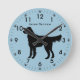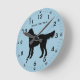 Wonderful black silhouette of an Irish Setter hunting dog. Clock numerals and ticks in black with small dog paw prints at each number. Background is transparent so you can pick a color to match your décor, we chose light blue. Personalize the text with your own by changing the template box.