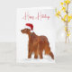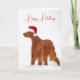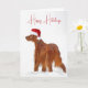 Irish setter in snow with Santa Claus hat and snowflakes.