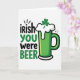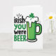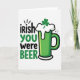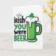The front design shows a funny St. Patrick’s Day pun with the phrase “Irish YOU were BEER” stacked on the left and a bright green beer mug on the right, setting a friendly, flirty tone like an inside joke shared between two people. “Irish” sits at the top in black with small radiating lines above it, like a little spotlight. “YOU” and “BEER” are colored green to echo the drink, while the rest of the words stay black for contrast. The mug is lime green with soft shading, outlined in black, and it leans into the joke as if it’s being offered to someone special 💚. A thick white foam cap spills over the rim, and tiny black dots around it hint at fizzy bubbles. A darker green shamrock rests on the foam like a small garnish, adding a classic Irish touch ☘️. The background stays white, keeping the green mug, black outlines, and stacked text crisp and easy to see for sharing St. Patrick's Day sentiments.