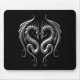 Two silver tribal dragons face each other in this aggressive symmetrical design. The winged serpents have the appearance of being cast out of solid iron which creates a stunning 3D look. The dragons sit on a pure black background creating a striking contrast. The metallic texture and deep silver colour gives this mousepad a stylish look.