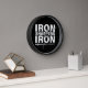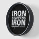 The Iron Sharpens Iron round wall clock, features Proverbs 27:17 in bold white font on a sleek black background. This 10-inch round clock is framed in premium black wood, adding a touch of strength and inspiration to any room. Perfect for game rooms, man caves, offices, or gyms, this statement timepiece blends faith with style.
