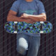 Irregular and disorganized mosaic overlaid blue skateboard