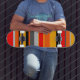 Un skateboard avec un design irrégulier et attrayant, rayé dans des couleurs harmonieuses.