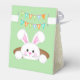 This adorable white bunny is peaking out to see if Easter is here. The front and back panels show the Easter Bunny. Above there are banners that read "HAPPY EASTER". The two side panels are beige with a floral pattern.