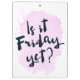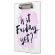 This fun clipboard features a watercolor splash background and the words Is it Friday yet? in a bold chunky script.