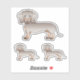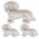 Destei's original cartoon illustration of a cute short hair Isabella and tan coat colour Dachshund breed dog. The design is placed three times on the sheet in two different sizes. There is one larger one and two smaller ones.