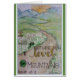 Illustration of a field with flowers and mountain range with upcoming sun in background.