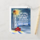 Inspirational quote scripture postcard depicts a watercolor lighthouse with the light shining through the blue snow filled night sky. It features a portion of Bible Verse Isaiah 60:20, "The Lord will be your everlasting light." _
