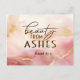 Postcard with inspirational quote scripture depicts a beautifully designed pink and gold watercolor background with exquisite texture and style. It features an encouraging portion of Bible Verse Isaiah 61 3, "Beauty from Ashes." The greeting, prayer can be personalized or deleted for a hand written message.
