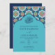 Crafted from premium white cardstock framed by an ornate border of replicated blue mosaic tiles, your wedding details stand out distinctly written in flowing Arabic calligraphy ink.