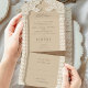 This all-in-one Islamic wedding invitation with a convenient perforated RSVP section is the epitome of elegance and functionality. It boasts a sophisticated design with a classic arch motif and chevron patterns in a refined palette of taupe, cream, and ivory. The perforated edge allows guests to easily tear away the RSVP, ensuring a seamless response process. Held in hand, it presents a cohesive look that seamlessly blends traditional Islamic art with modern convenience, perfect for the couple looking for a stylish, efficient way to manage their wedding correspondence.