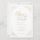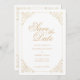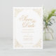 White and Gold Islamic Muslim Wedding Save The Date card. Vintage style baroque corner frame announcement that can be used for the Nikah, Mehndi and Walima ceremony. There is a luxury calligraphy font in gold colour. Personalize the colour, type and size of the fonts and the colour of the card as well. On the second card, you can add text. Different paper types are available for you to choose from. HerLineForDesign by Ayesha A.Hussain.