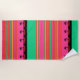 Relax on a beach towel decorated with island palm trees on green and pink background.