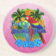 Island time is a reference to how life is on islands, people are more apt to slow down and enjoy life. Rather than the normal rat race we live in on the main land. Beautiful beach sunset behind surfboards and palm trees, framed with bamboo and hibiscus flowers. And a colourful macaw parrot.