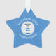 Star shaped ornament for holiday and Hanukkah decor featuring an angel dressed in the blue and white flag of Israel. Designed for families of multiple religions. The Hanukkah Israeli flag angel flies inside a white circle of squiggly squares, surrounded by a background of blue squiggly squares. Add a name to personalize. Customize with the year. Or, add your own text.