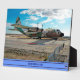 A digital rendition of an Israeli Air Force (IAF) C-130H Rhinoceros (קרנף) in desert camouflage at a desert air base. Mixed Hebrew-English text reading "C-130H Hercules (קרנף)" appears at bottom on an elongated version of the IAF flag.