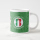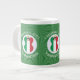 Jumbo coffee mug to help you celebrate Christmas with this angel dressed in the Flag of Italy. This African American angel flies in the centre of a white, fractal, circle of squiggly squares set in a background of green squiggly squares. Add your name, or the name of someone else, if giving as a gift, to personalize. Customize by changing the ?? to a year of your choice to create a mug. Designed to augment your Christmas decor this holiday season. Design shows on three sides. Change the font and/or colour of the name, holiday or year by using the "edit design" option.