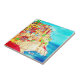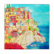 Italian Coast Scene contemporary ceramic tile in predominant blues with splashes of other pastel colors. Colorful scene showing a steep cliff with crowded multicolored houses stacking upward. Stairs on side of cliff climb steeply upward. Shows cool blue waters and lighter blue for sky. A boat lingers in the water by the cliff. Quaint and charming done by artist in mixed media.