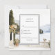 Perfect design for your wedding RSVP card : watercolor painting captures the timeless elegance of an Italian lakeside promenade, likely inspired by Lake Como. A stone walkway shaded by a vine-covered pergola extends along the waterfront, flanked by potted flowers and cypress trees. The serene blue lake mirrors the surrounding misty mountains and rolling hills. Across the water, a historic villa with terracotta rooftops and arched facades stands prominently, with a bell tower rising gracefully in the centre. The entire scene is bathed in soft, natural light, evoking peace, beauty, and an old-world charm.