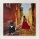Puzzle représentant une peinture d'une rue dans un village italien avec une dame en rouge et un mignon gros chat en smoking. Art par Anne Vis.