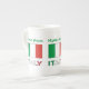 None china mug shows the red, white and green Italian flag or Il Tricolore. Below is the word ITALY, also in the Italian tricolor. Above is a place for a name, in green letters,to add a customized look. Or, create a personalized gift by adding some else's name. Design shows on three sides of mug. Fun for Italian family reunions, travel groups, and clubs.