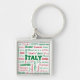 A fun keychain featuring cities of Italy in the colours of the Italian flag... red and green on a white background.