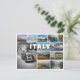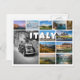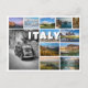 Souvenir photo collage postcard of Italy with the variouw beautiful landscapes with the Dolomites mountains, cities, Tuscany, beaches of Sardinia and Sicily, Cinque Terre and Apulia with the text 'Italy' in white.