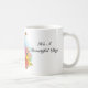 This coffee mug is shown with a lovely flower print with a phrase "It's a beautiful day".