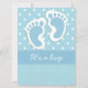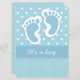 This baby shower invitation features a design of two blue baby footprints, on a varied blue and white polka dot background. The centre stripe has stitching details, and customizable "It's a boy" text. The blue background on the back, and informational text, can be customized as desired.