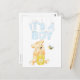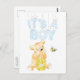 Adorable typography, "It's a Boy" baby shower design featuring a cute teddy bear with a barrel of honey watching a cute honey bee. The fun blue lettered typography is strung at top with cute strings and dangle down. Blue florals and templates to create your own invitation on back.