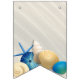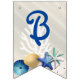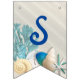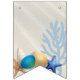 Boy's beach themed baby shower banner flag bunting. White sand, blue, teal and turquoise sea shells, starfish, sea horse ocean details.
