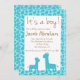 A striking blue giraffe pattern as a decorative border for your baby boy announcement or baby show invite with the message "It's a boy!". A cute silhouette of a baby giraffe and its parent as part of the design. Personalise easily with your party details.