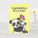 A customizable greetings card for new parents featuring a cartoon Panda bear lifting a baby bear into the air for hugs and cuddles. The text reads "congratulations it's a boy" but you can customize all the text to suit your needs.