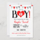A Valentine's Day theme baby shower invitation is perfect for the month of love. Black and white patterns inside a bunting banner with red roses along with a heart with baby footprints inside.