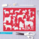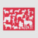 This design features a collage of several different dog breed silhouettes on a red background.
