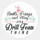 A coral-coloured girl in a classic drill team uniform poses at the top of the design declaring Boot, Fringe and Bling in a black script font. Surrounding the words 'and bling' are a mint-coloured pair off poms,with a hat and boot. Coral lines separate the top and bottom of the design. The bottom of the design states its a Drill Team Thing in black with mint shadowing on the word Drill Team.