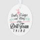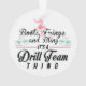 A coral-coloured girl in a classic drill team uniform poses at the top of the design declaring Boot, Fringe and Bling in a black script font. Surrounding the words 'and bling' are a mint-coloured pair off poms,with a hat and boot. Coral lines separate the top and bottom of the design. The bottom of the design states its a Drill Team Thing in black with mint shadowing on the word Drill Team.