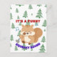 A cute and festive digital illustration featuring a chubby cartoon squirrel singing joyfully into a microphone. The squirrel is surrounded by blue musical notes, holding the mic with excitement. The text above and below reads "IT'S A FUNNY SQUEAKY SOUND" in bold red and purple font. The background consists of a repeating pattern of green sketched Christmas trees on a light grey backdrop, creating a humorous and holiday-themed design perfect for winter celebrations.
