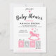 Cute baby girl shower invitation with a rocking horse silhouette in pink, little hearts in grey and pink and kids cubes in pink and grey.