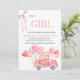 This charming baby shower invitation celebrates the arrival of a baby girl with a warm and whimsical design. The phrase "IT'S A GIRL" takes centre stage in an elegant, soft coral font, paired with a decorative ribbon illustration for a touch of sophistication. Below, personalized event details are neatly arranged in a graceful font for easy readability. The bottom showcases an adorable illustration of a vintage red car carrying a bundle of pink heart-shaped balloons, evoking joy and festivity. The overall design blends warmth, elegance, and playfulness, making it perfect for a special celebration.