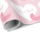 This wrapping paper features a repeated design of a white heart, with the customizable text, "It's a Girl". Behind the heart is a pink and white gingham pattern, and below the heart is a pink baby stroller.