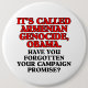 Obama is such a liar. While campaigning, he repeatedly promised to call the Armenian genocide what it was: genocide. But now that he's had multiple opportunities to do just that, he has refused to follow through, instead opting to call it things such as 'one of the worst atrocities' of the 20th century and 'a devastating chapter' in history. Express your feelings with this anti-Obama merchandise: It's called Armenian genocide, Obama. Have you forgotten your campaign promise?