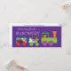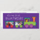 This cute first birthday invitation features a bright purple background and a train driven by a bear conductor. The invitation can be customized with two of your own baby's photos. Text on the front read: it's my first birthday.