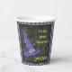 A fun square party paper cup with a floating purple and teal blue enchanted witch hat that says "It's that Witchy Time Of Year, Let's Party" on a dark charcoal black background with a teal blue border. All the text is editable.