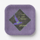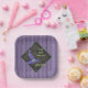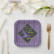 A fun square party paper plate with a floating purple and teal blue enchanted witch hat that says "It's that Witchy Time Of Year, Let's Party" on a dark charcoal black background with a teal blue border. All the text is editable.